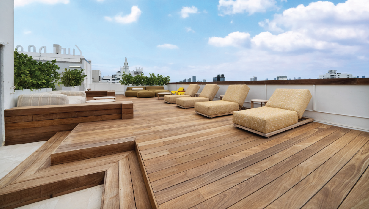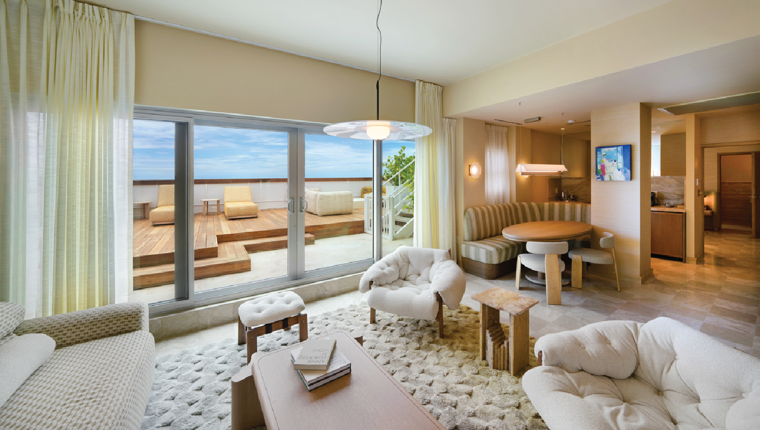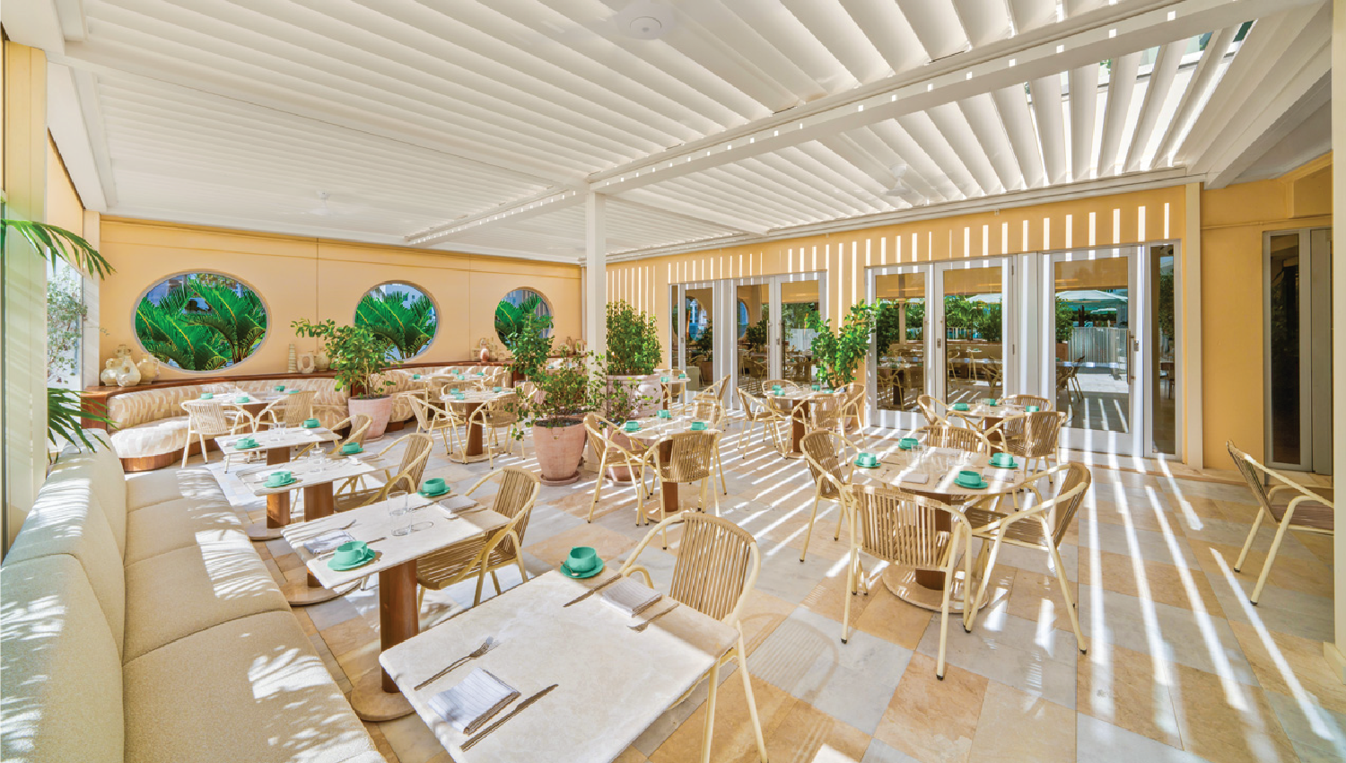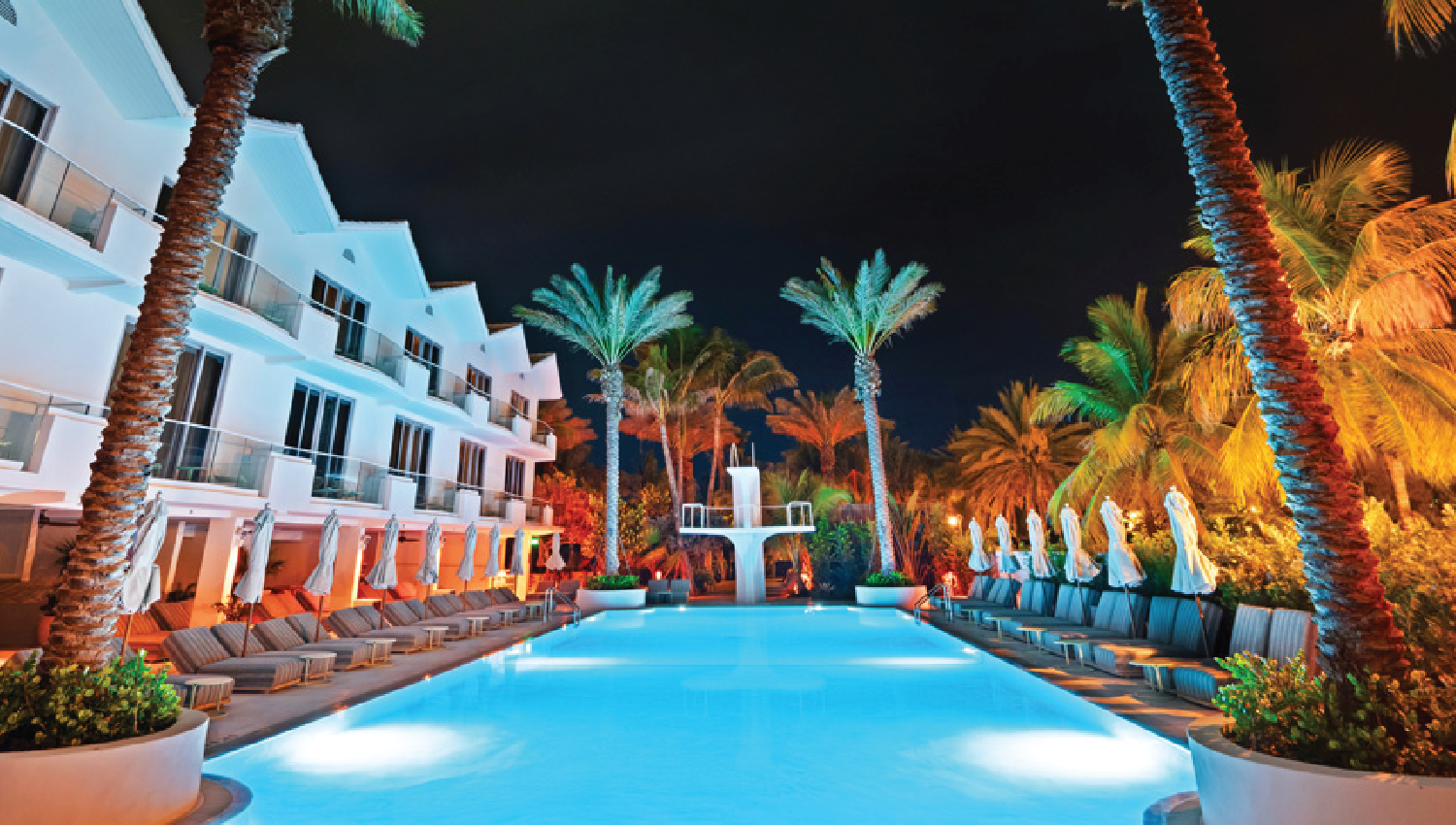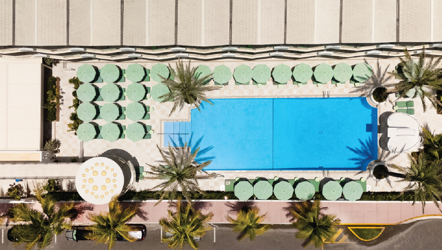Exterior scope spanned 45,000 SF: new pool deck, nine cabanas, outdoor dining outlet, and landscape/hardscape upgrades.